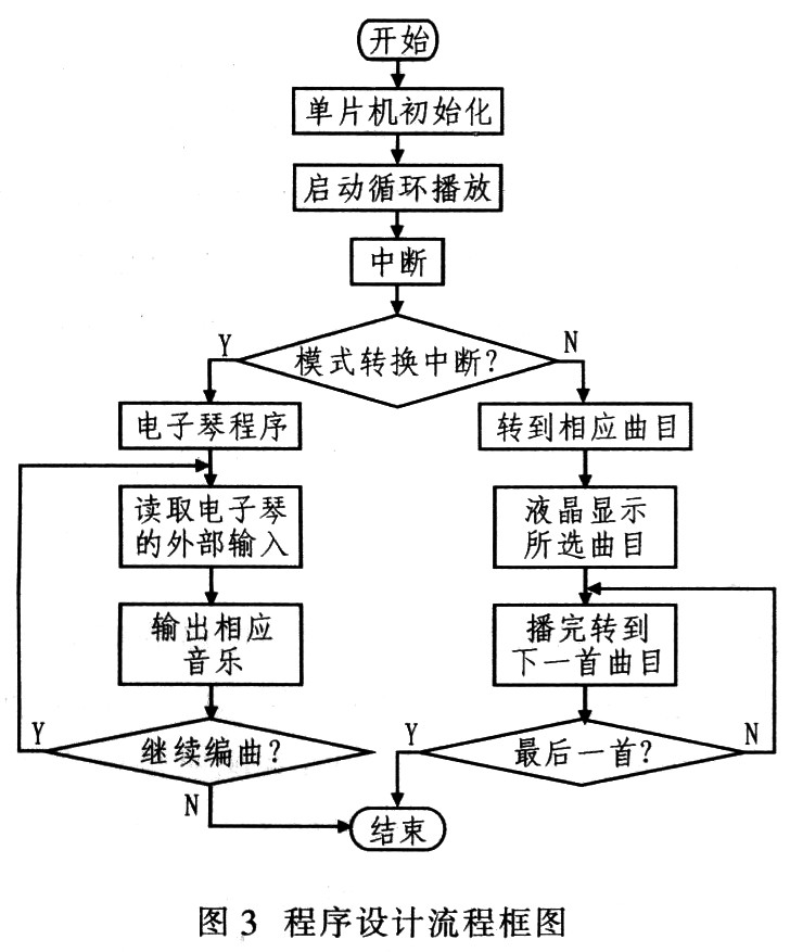 系统初始化后,进入默认播放功能。开始从第一首曲目开始循环播放。如果启动中断,判断是否为模式切换。如果是,则进入自编曲电子琴功能,实现自弹自编。如果不是,则继续循环播放内设音乐。播放过程中如果出现跳选曲目.则进入相应的曲目程序.程序设计流程如图3所示。