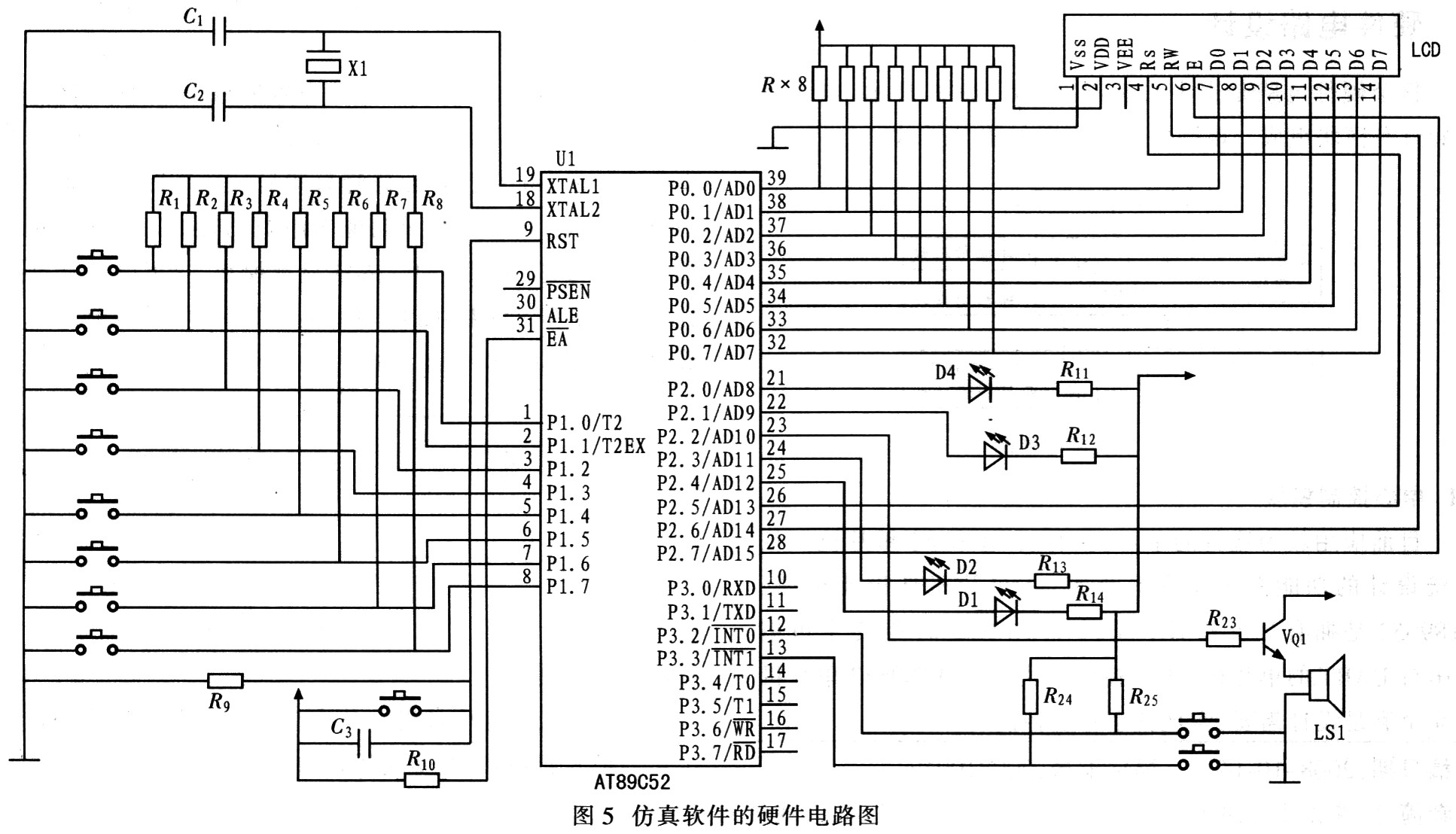 采用绘制电路图软件PROTEUS和用于编写程序的KeilCμVision2实现系统设计的仿真。图5为PROTEUS仿真环境下的硬件电路图。在KeilC μVision2中创建一个新项目,然后在PROTEUS中为该项目加入Keil C源程序。调试后,结果和设计目标完全吻合。上电后液晶显示器显示“Wel-come!”,接着显示第一首歌曲名字,连续播放直到手动选择。同时4盏彩灯随着音乐节奏闪动。按下模式转换按钮,可以弹奏用户喜欢的音符和乐曲。