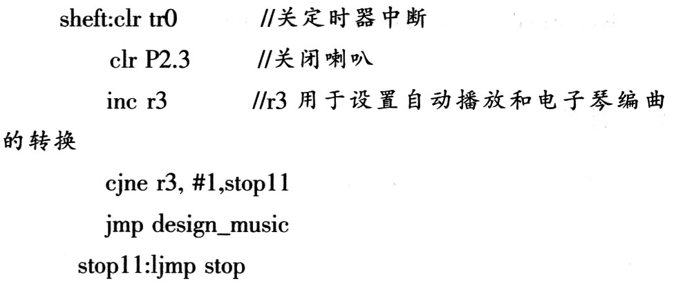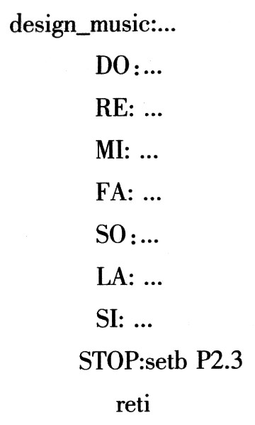 电子琴设有8个按键,其中7个作为音符输入,另外1个作为模式转换按键,实现用户自弹作曲。7个按键分别代表7个音符,包括中音段的全部音符。通过软硬件设计,模式转换按键触发外部中断,中断使程序跳转,实现模式转换,启动电子琴。然后通过查询电子琴所按下的按键,读取电子琴输入状态,跳转到对应的程序人口,实现自编歌曲。当需要取消电子琴编曲功能时,再次按下模式转换按键引起外部中断.即可退出电子琴功能而返回到原来音乐播放处。